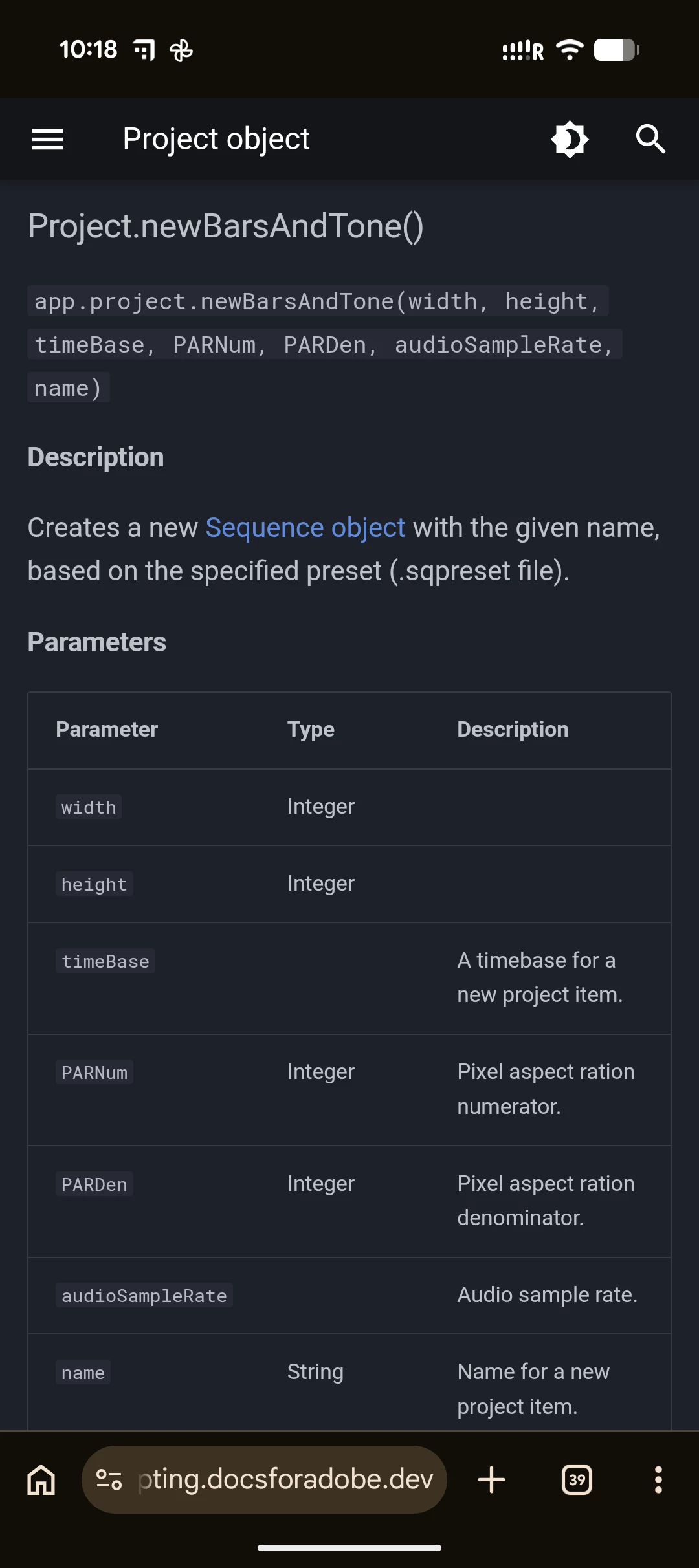var bars = app.project.newBarsAndTone(1920, 1080, "24.00 fps", 1, 1, audioSampleRate, "filler");So it's not a string, even though the docs say a timebase is a string