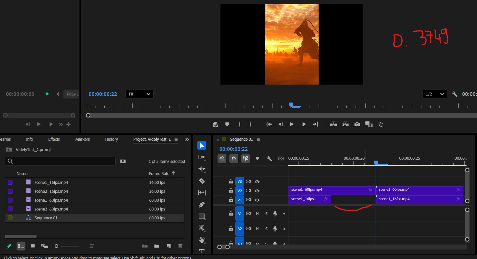 0.3749 × 60 = 22.494 ≈ 22frames. Next clip starts immediately after.