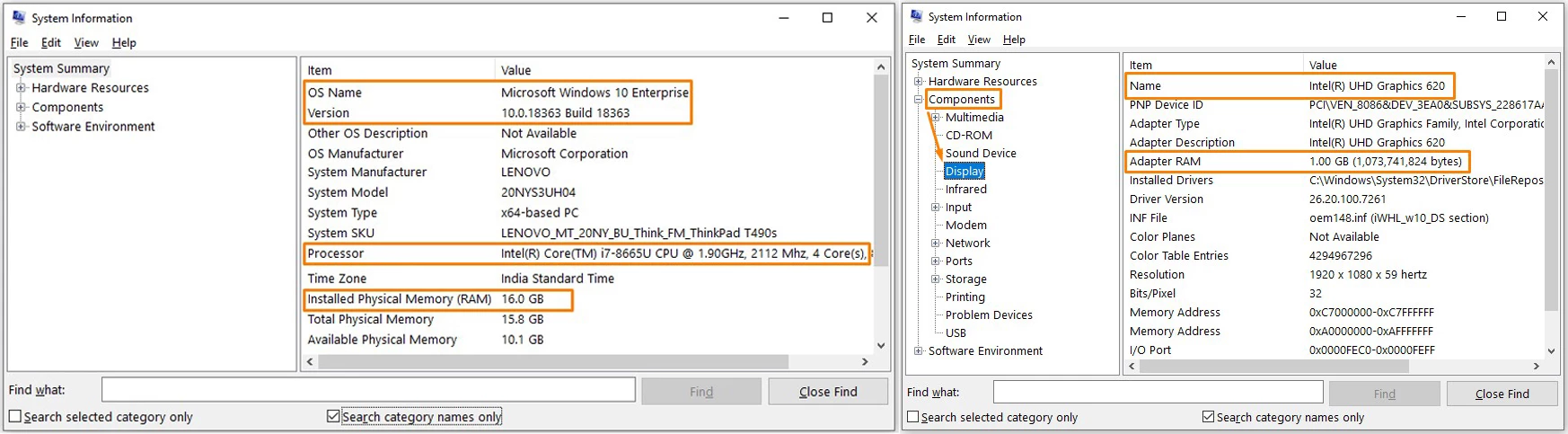 The System Summary page should give you the basic info about the Windows version, CPU model and amount of RAM installed.