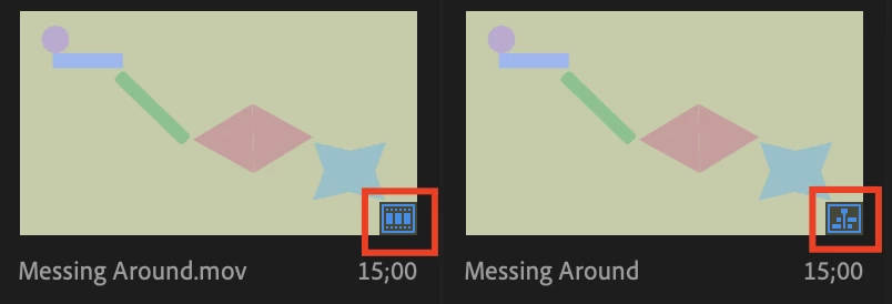 If you are in Icon View, be sure you can tell the difference between the Clip icon (left) and the Sequence icon (right). Simply, double click the Sequence icon to reopen your timeline or sequence. Your work is now "found" or restored.