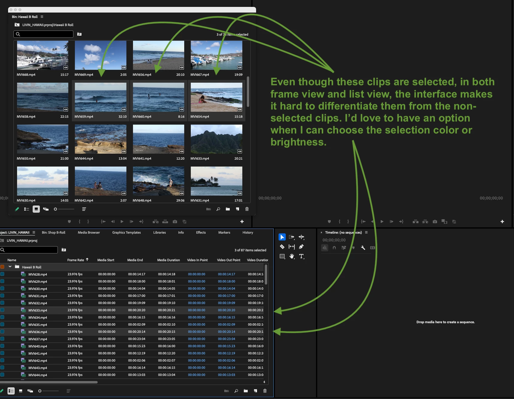 FEATURE REQUEST - Could you add an option so we can make a clip selection in a bin a customizable color or brightness? When I open a bin and select a clip the selection is always a slightly brighter grey than all the non-selected clips. Even on a large monitor its often hard to see exactly what is selected. I'd like to have an option so if I select one or multiple clips they can be light blue or brighter gray or whatever color I choose.