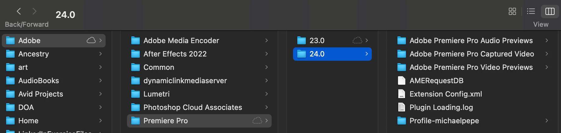 I'm confused about what's going on inside my Document/Adobe folder, which I did not create (screenshot below). Inside the "Premiere Pro" folder are two folders called "23.0" and "24.0," representing the original and upgraded versions of Pr (very annoying). I can see that this folder will get very large over time. Once I finish editing a project, is it safe to delete these folders? Can I safely delete the folder for the previous version? Do I have to move files? What is the purpose of the Documents/Adobe folder where there are also subfolders for AE, ME, and other Adobe products? Thank you.