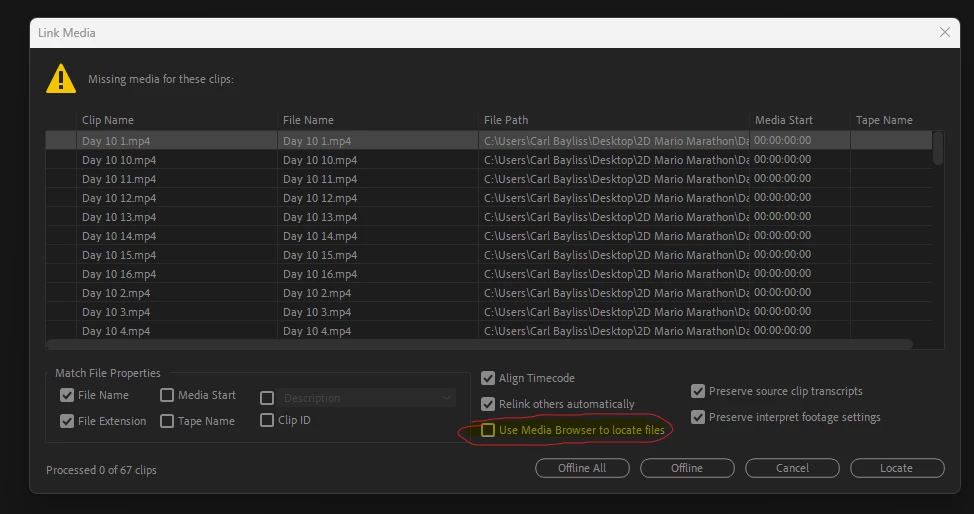 This wouldn't be such an issue except if the drive goes to sleep after leaving the computer on all night, any open Premiere project using those files will have missing links. When I "wake up" the drive enclosure and try to relink the footage - the relinking tool uses media browser... which... doesn't see the files on the drive.