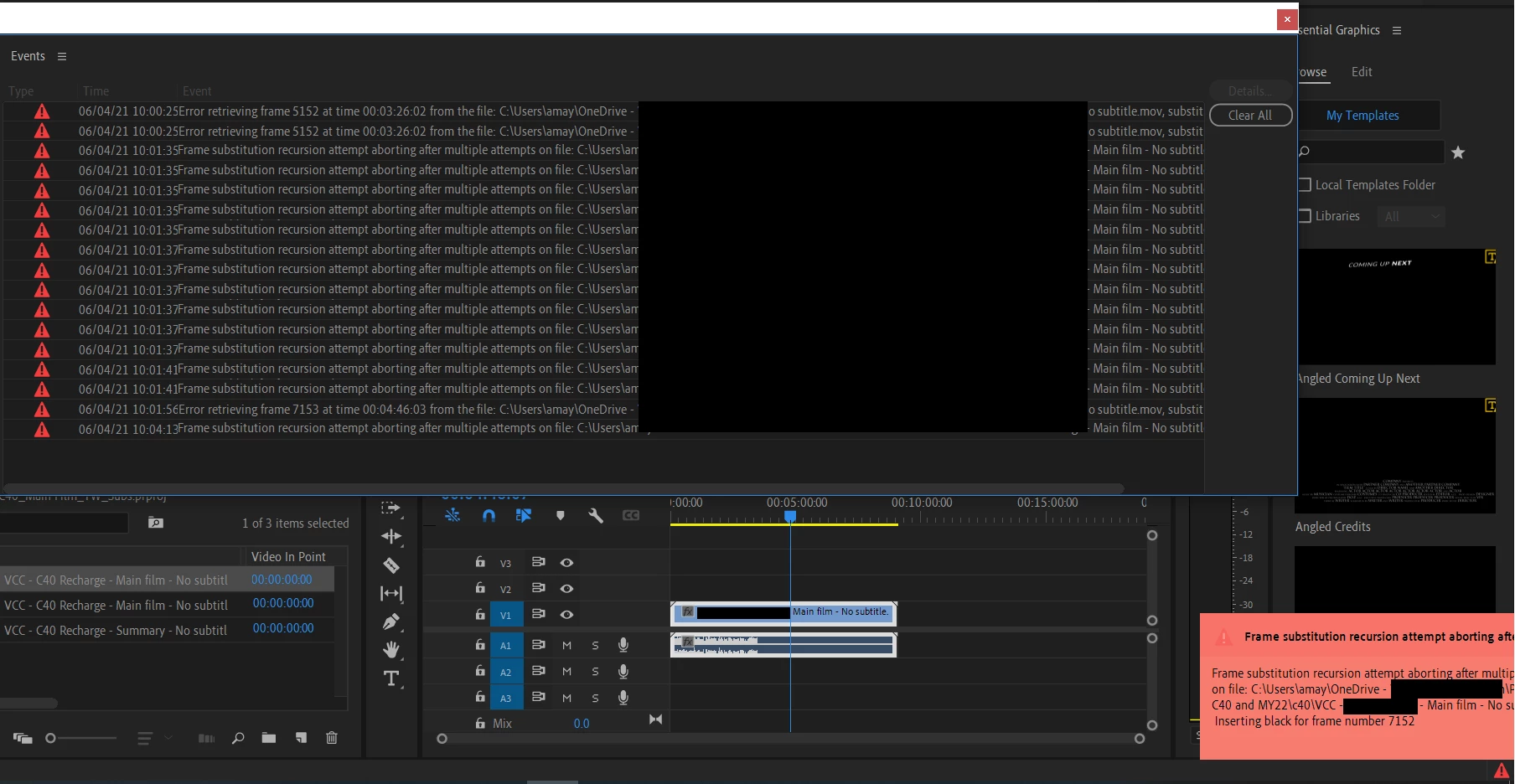 The video stopped playing half way. It was just a black screen. The subtitles still showed on screen though. I have shut down Premiere Pro, reopened it, re-added all the videos and subtitle files, and this still shows.