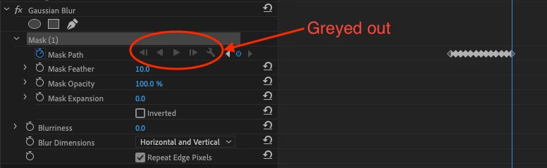I have a rectangular mask on a gaussian blur effect. As I click "Track selected mask forward 1 frame," it slowly tracks: the buttons grey out, then the frame advances and the mask has (hopefully) moved to track the object (not always, but that's a problem for another day). After some nondeterministic number of clicks of the button (could be 1, could be 10), the track forward/backward buttons grey out as normal, but then nothing happens. The frame doesn't advance, the new keyframe isn't added, and the buttons are no longer clickable. Like so: