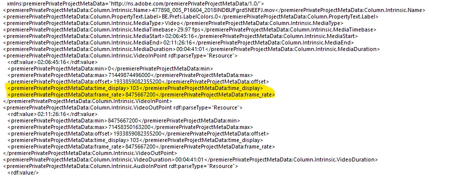 I'm trying to access the "frame_rate" or "time_display" from a clips metadata via Extendscript. I can see the fields (highlighted below) when I alert projItem.getProjectMetadata but when I try to access those fields independantly (following the example from the sample panel) it doesn't return anything. See code below. I know you need "Column.Intrinsic.VideoInPoint" in the URI for the Clip In Point, does anyone know what you need for the highlighted fields?