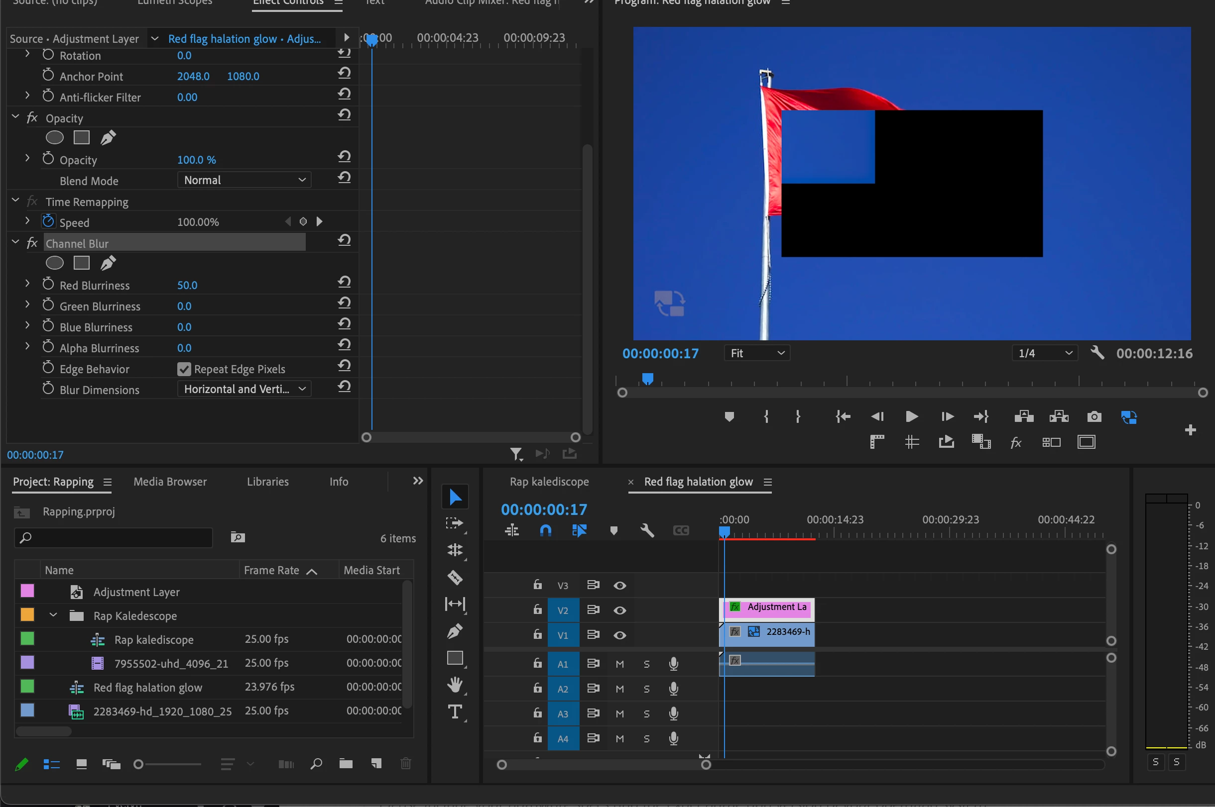 I applied the channel blur effect on the adjustment layer and a random dark box popped up.