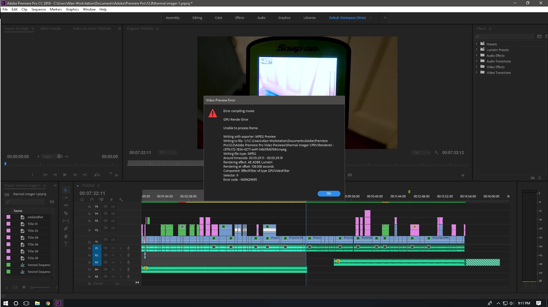 Ok I'm pulling my freaking hair out. I constantly run into GPU Render Errors, but usually a reboot fixes things. Today I have been trying for about 3 hours to get a project to export, with no luck. I can fully Render the timeline in the project, but when I head to Export, it fails in a matter of minutes. I cleared my cache files and attempted again. Shut down and let the computer sit. Checked for drivers updates. Checked for Premiere updates. This has been a constant issue for me lately and it is really getting old. Today is just worse than it has been in a while. I had read somewhere to open AME before Premiere and export via Queuing to AME. However I have found that to be FAR WORSE for this GPU Render error.