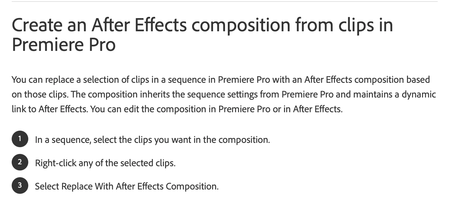- Select clips in subsequence>right-click>select Replace with AE composition. This created a new project and composition, but also opened up a dialog box without any prompts of what I'm supposed to be selecting. I can see that one of the clips in the sequence copied over, but not both. Although, I followed the instructions on the Support page: both images below.
