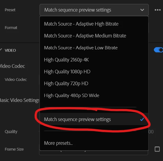 Also: how do I set the export up in the new export window? Choosing "match sequence settings" doesn't seem to work...?