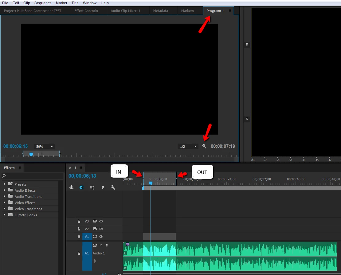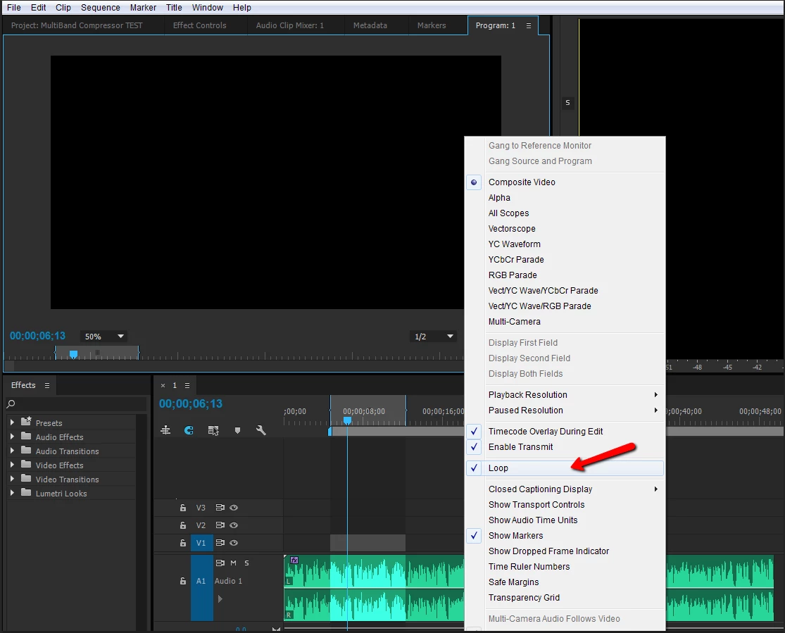 I am editing an audio file. Need to play around with equalizer settings and I want to set an IN & OUT point (which I have already done on the timeline), but now how do I get the timeline to loop between my IN/OUT points so that I can play with my EQ settings?