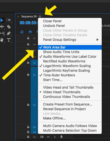Click on the three horizontal lines next to the Sequence Name, then toggle off Work Bar Area: