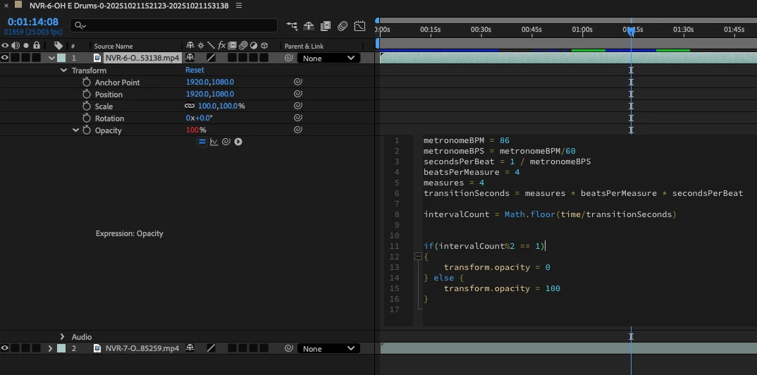 For example, I could manually modify the opacity of the 'top' clip to 0% to let the lower show through, then re-set to 100% every so often.. but doing this precisely, and accurately, would be a time consuming task.