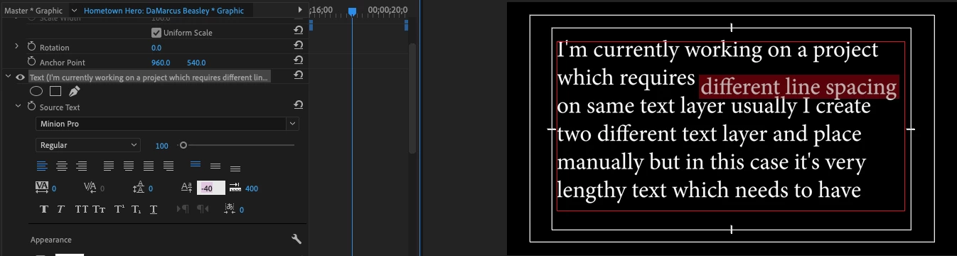 I'm currently working on a project which requires different line spacing on same text layer usually I create two different text layer and place manually but in this case it's very lengthy text which needs to have animation like film credits but I wanted it to be formated by using line space option separately over line. does anybody know how can I do this.
