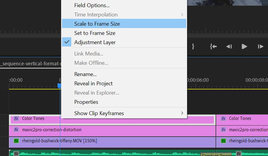 For this project, I'm doing a horizontal format video for desktop as well as a vertical format video to compensate for frame sizes on mobile. I did a horizontal format sequence first, 3840 x 2160 (16:9), then once the edits were done, I duplicated the sequence to change to a vertical format by going to Seqeuence > Sequence settings > Frame Size, changed it to 2160 x 3840 (9:16) and clicked apply. After that, I changed the rotation of the video in Effect Controls under Motion > Rotation to -90. When I did that, the effect didn't apply to the entire frame size of the video, just an portioned area as if still applied in horizontal format. I also tried right-click on the adjustment layer, and select "Set to Frame Size" and/or "Scale to Frame Size" and those options didnt't work. See secreenshot below.