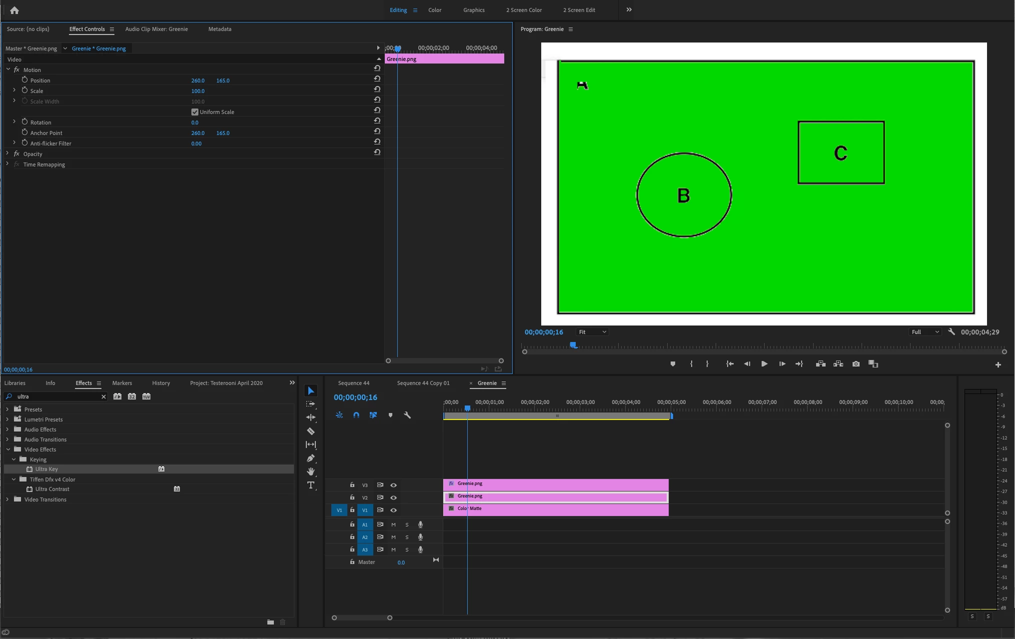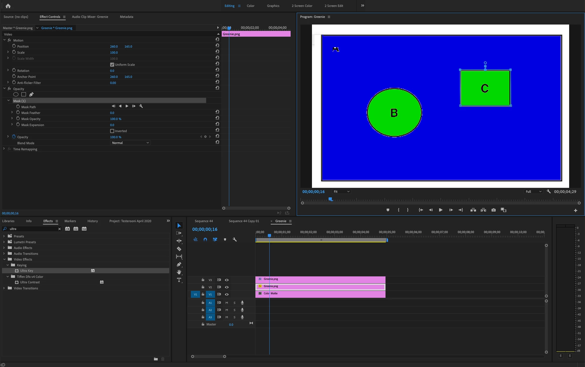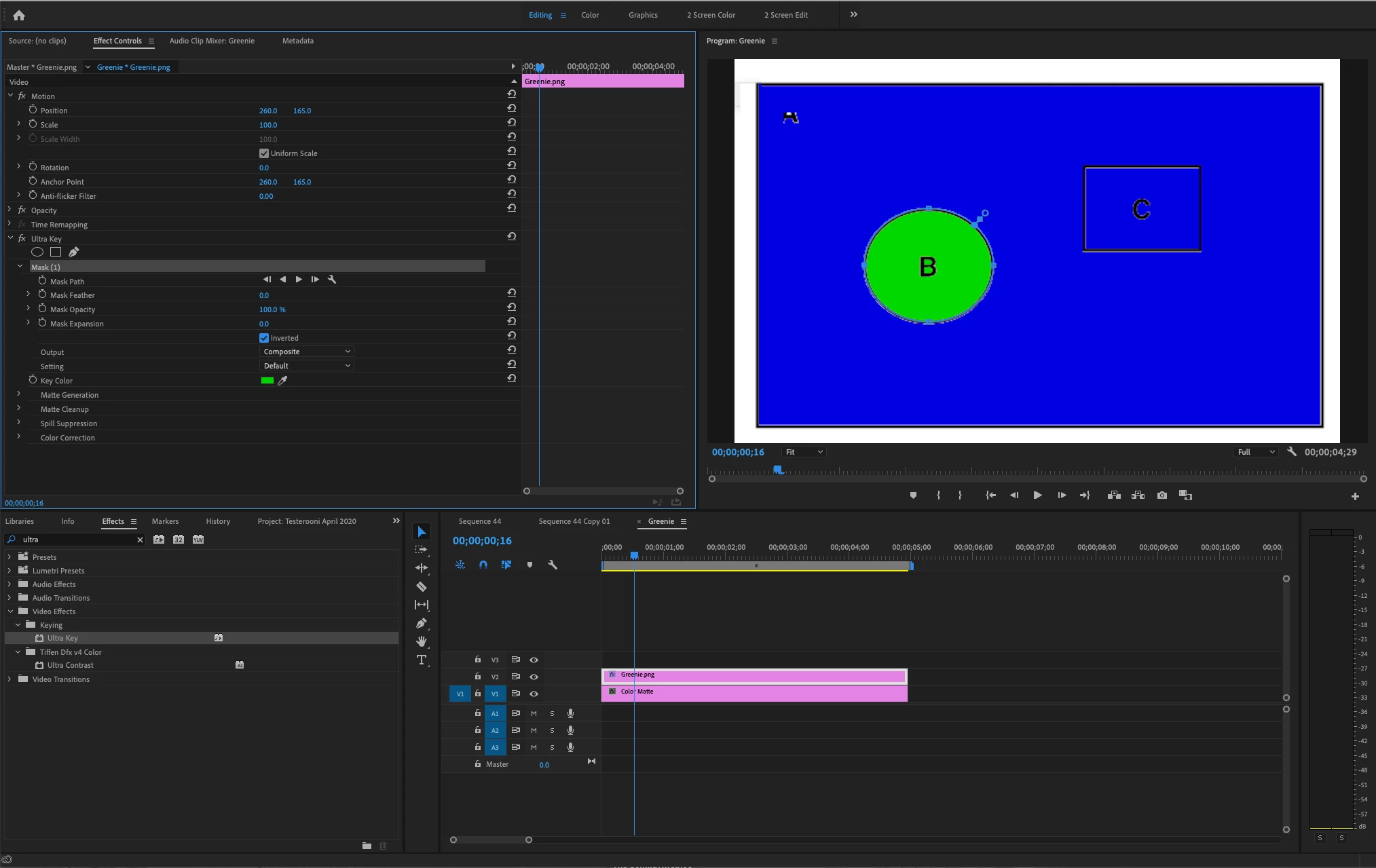 Hi. I want to give ultra(chroma) key effect on A except B and C.