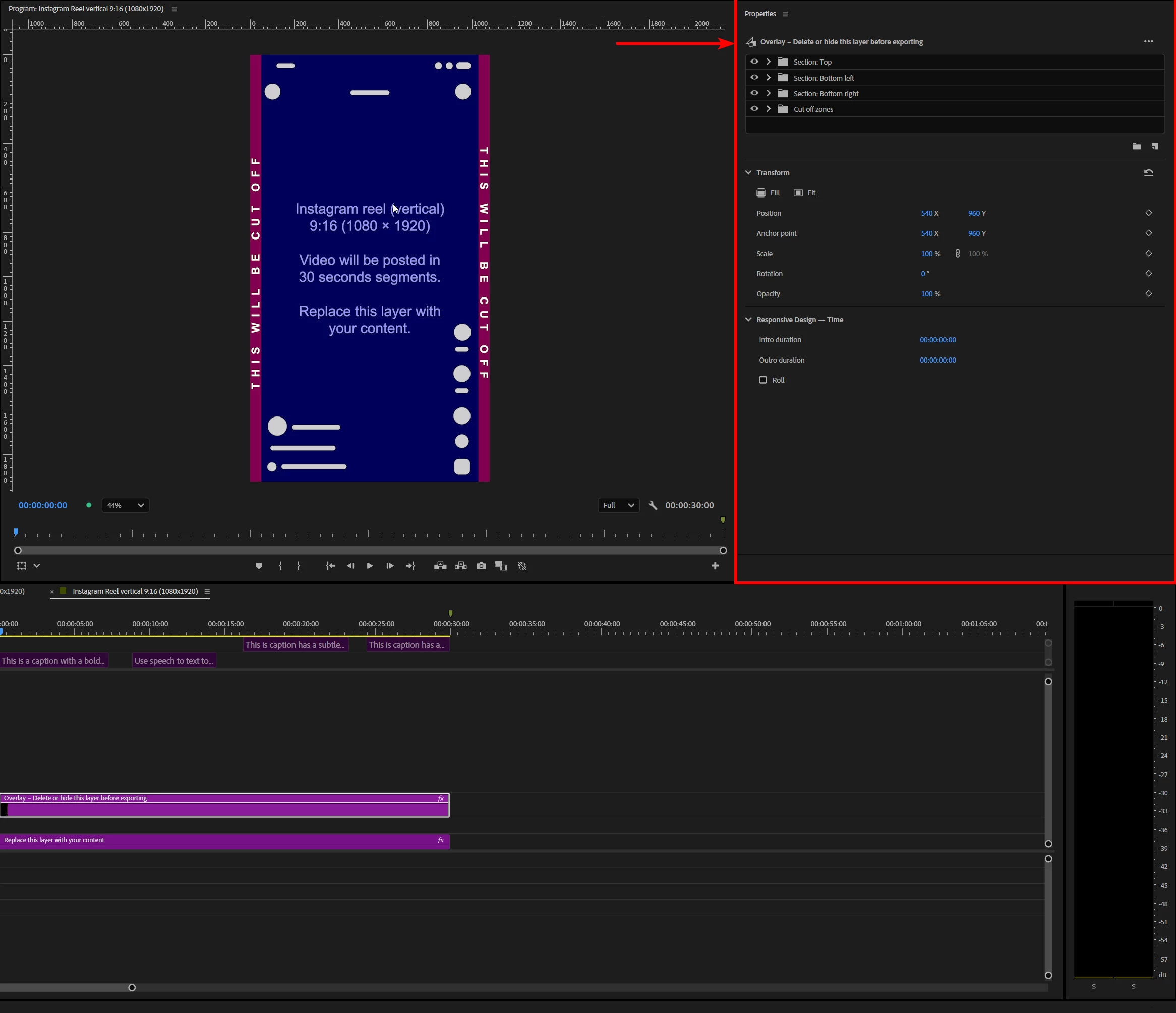 Inside that template, there are prebuilt overlay elements like visual guidelines nd 9:16 formatting helpers.