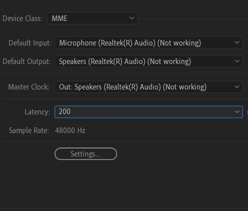 hello. im new to premiere pro but recently i put a video clip that has audio in it but i cant hear it (this also occurs with music), i can hear it once i export the file and ive watched a few youtube videos to try to fix this problem but nothings working. the only thing i found out is that my speaker & microphone say it doesnt work even though in other apps it does, help please??