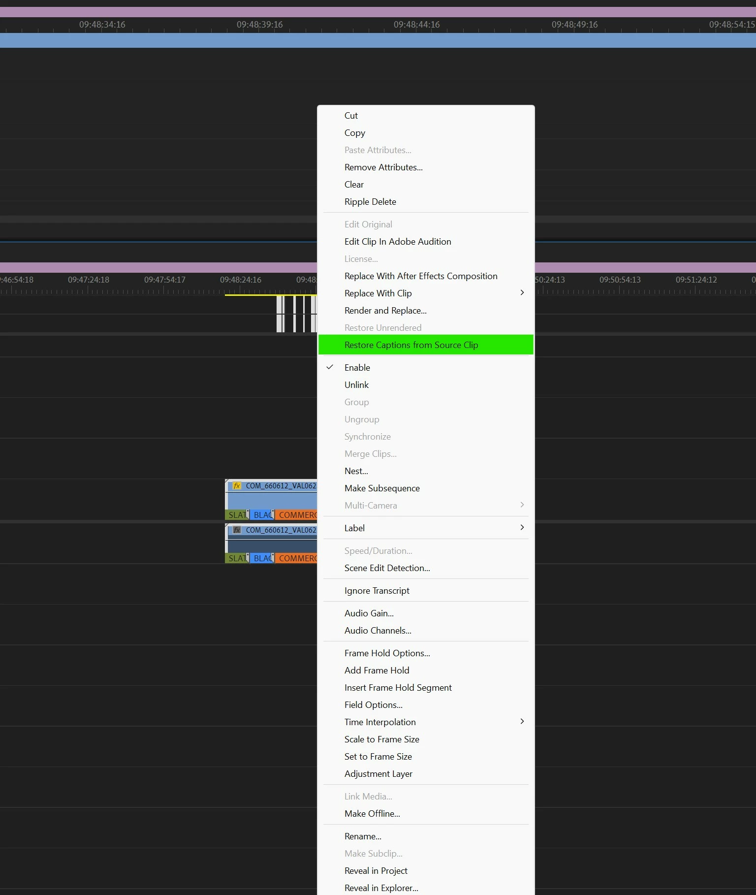 2) Right-click on the clip once imported in the timeline and click [restore captions from source clip]