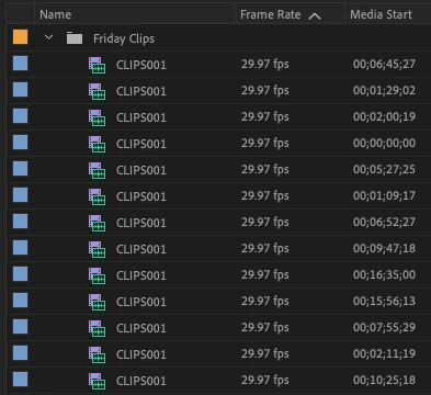 Imported Clips from a C300 Mark II and C200 and they are all named "CLIPS001"