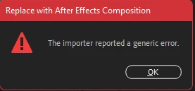 replace with after effects composition - "the importer reported a generic error"