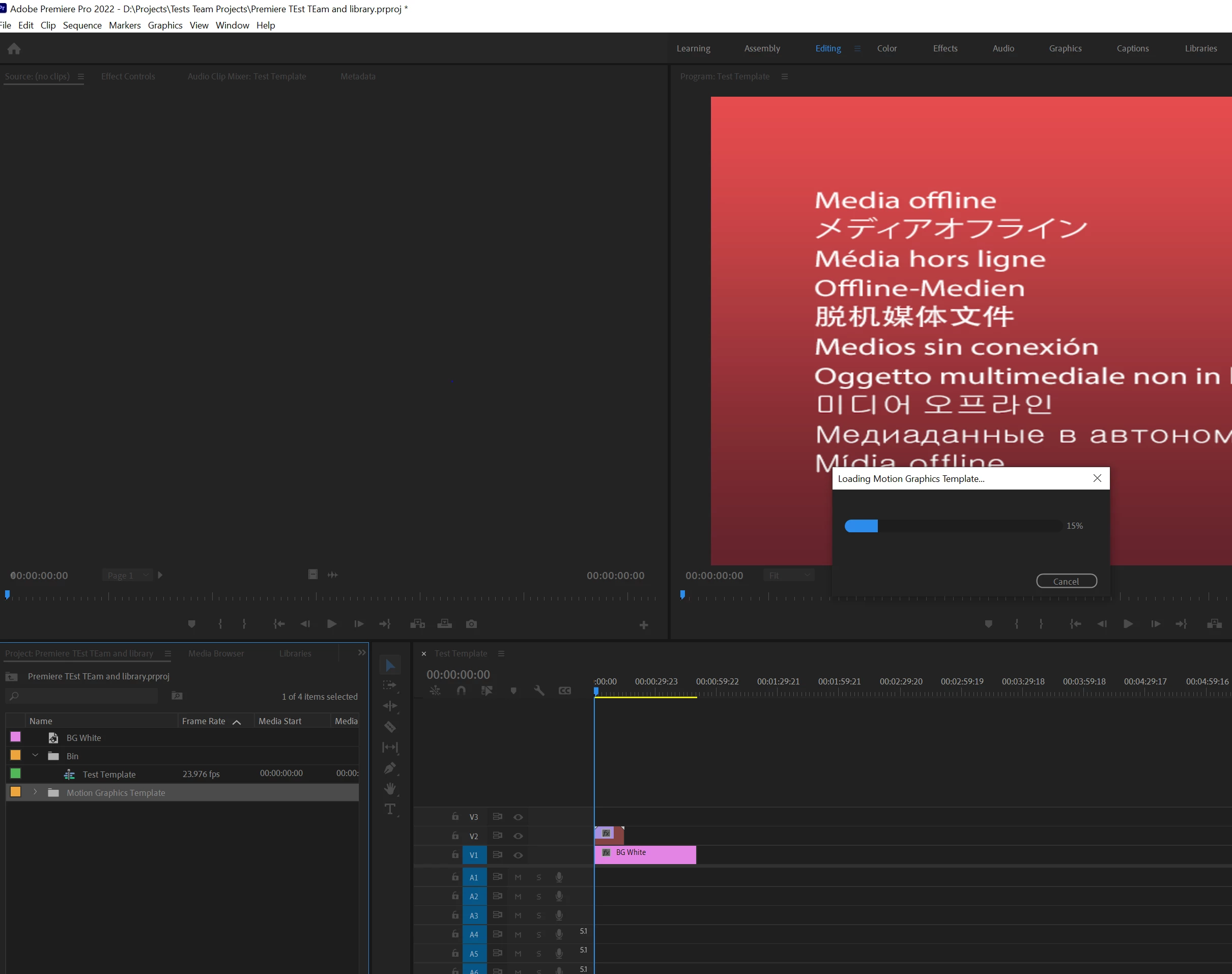 Then when testing, tried importing a Motion Graphics template and it gets stuck at 15%. Tested with two different computers, and I get the same behavior.