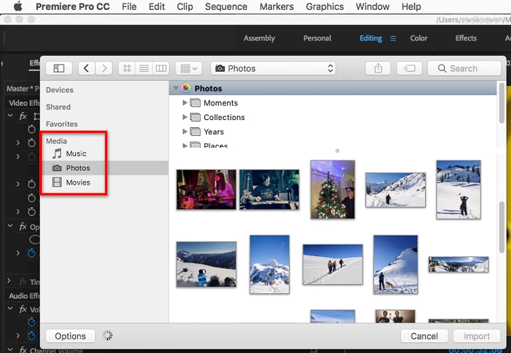 A. Use the Media panel of the Mac Import dialog box. In Premiere Pro, after you choose File > Import, look in the left sidebar for the Media section. You may have to scroll the left sidebar if the Media section is hidden. Inside the Media section are three items: Music, Photos, and Movies. Music is your iTunes library, Photos is your Apple Photos library, and Movies is your iMovie library. When you select one, the contents are shown in the right side panel. You can select one item (or multiple items with the Shift or Command keys), and when you click Import, they will be added to the Project panel in Premiere Pro.