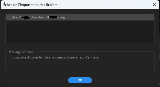 J'essaye de changer les photos sous format JPEG, PNG mais rien n'y fait, je ne peux pas le mettre sur Premiere Pro, j'ai également tenté de mettre sur Photoshop (pour voir si c'est RGV ou autre)mais là aussi on m'indique cette erreur : "Impossible d'effectuer cette action en raison d'une erreur d'un programme".