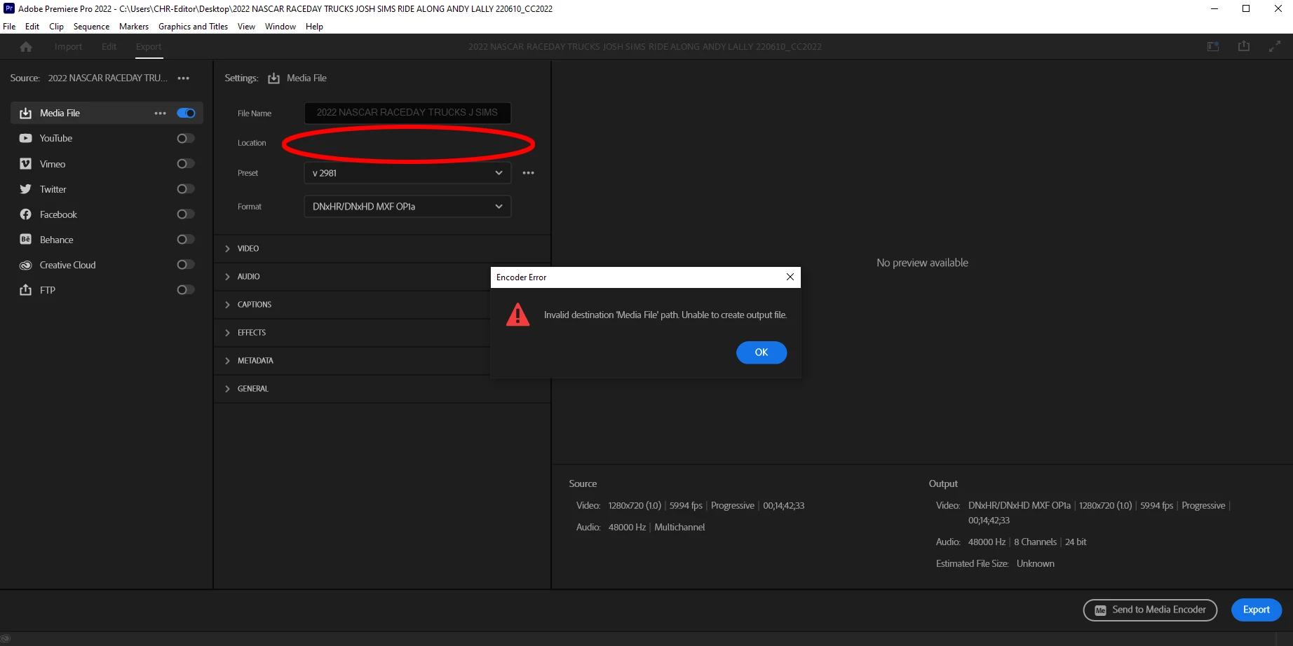 This time I held down Shift + Alt on the launch and cleared the plug-in cache as well. This initially brought the blue text link back... Once I clicked the link to navigate to a location, the export window wiped out my filename and the blue text link went back to blank. I clicked into the blank space... Premiere opened up a location window. I selected desktop, and I am now able to export to that location. Very weird bug here. Running CC2022.4 on windows 10 bulid 21H2. Is there a place to alert Adobe to this issue. Has happened more than once.