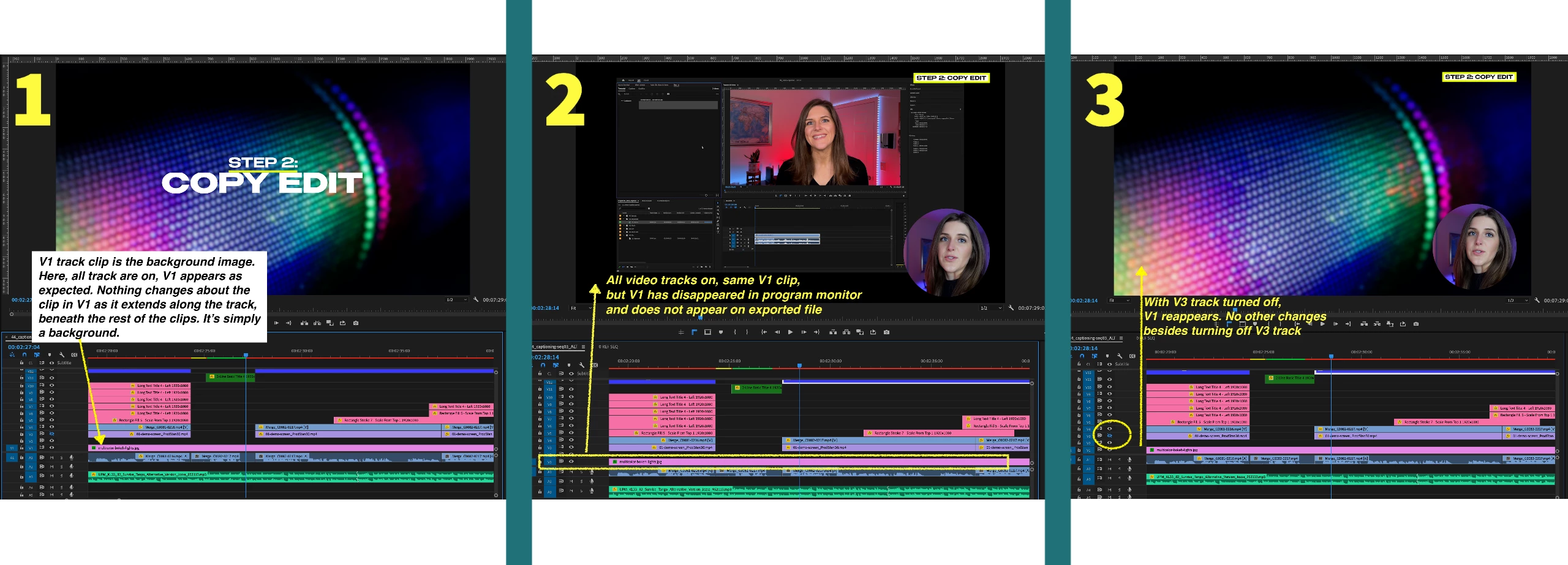 I don't know the appropriate terms to describe what's happening. The image clip I have on V1 track keeps appearing and reappearing, without any sort of consistency that I can see. The clip I have on V1 is simply a background image, so it's one long image clip underneath all the other layers of videos and text graphics. Nothing happens in that clip, it just sits there, static. V1 seems to appear when the V3 track is empty, but V1 disappears when once a clip appears in the V3 track—but not always! Only sometimes. Sometimes V1 will suddenly be visible as playback continues, even when nothing has changed in the tracks above it. I'm attaching screenshots to show the progression of what I'm talking about. This issue is occuring both in the editing sequence and in the exported file.