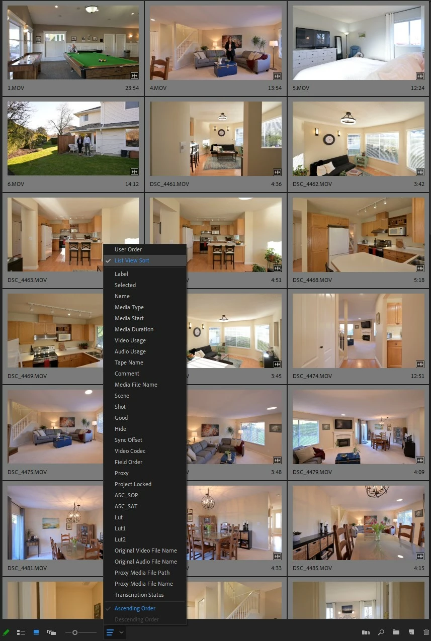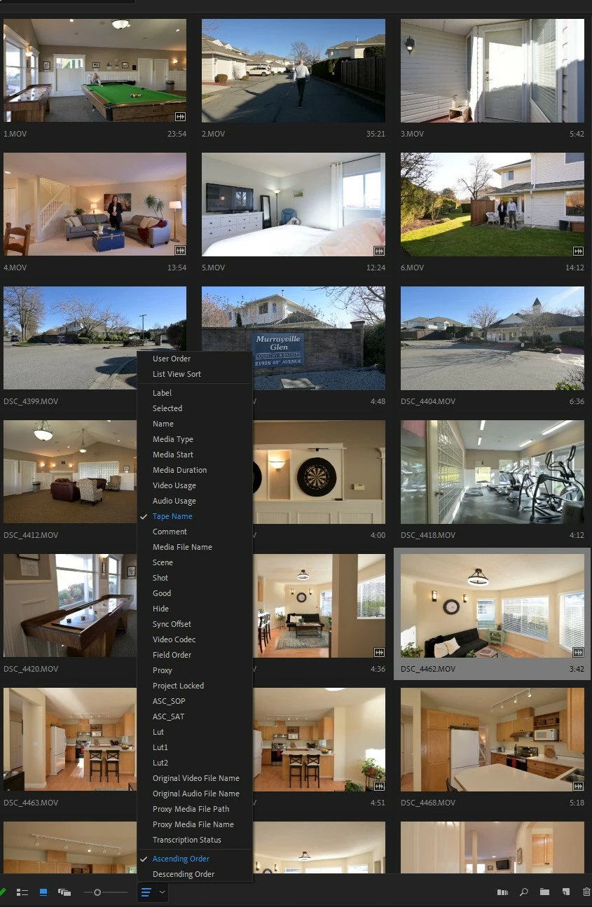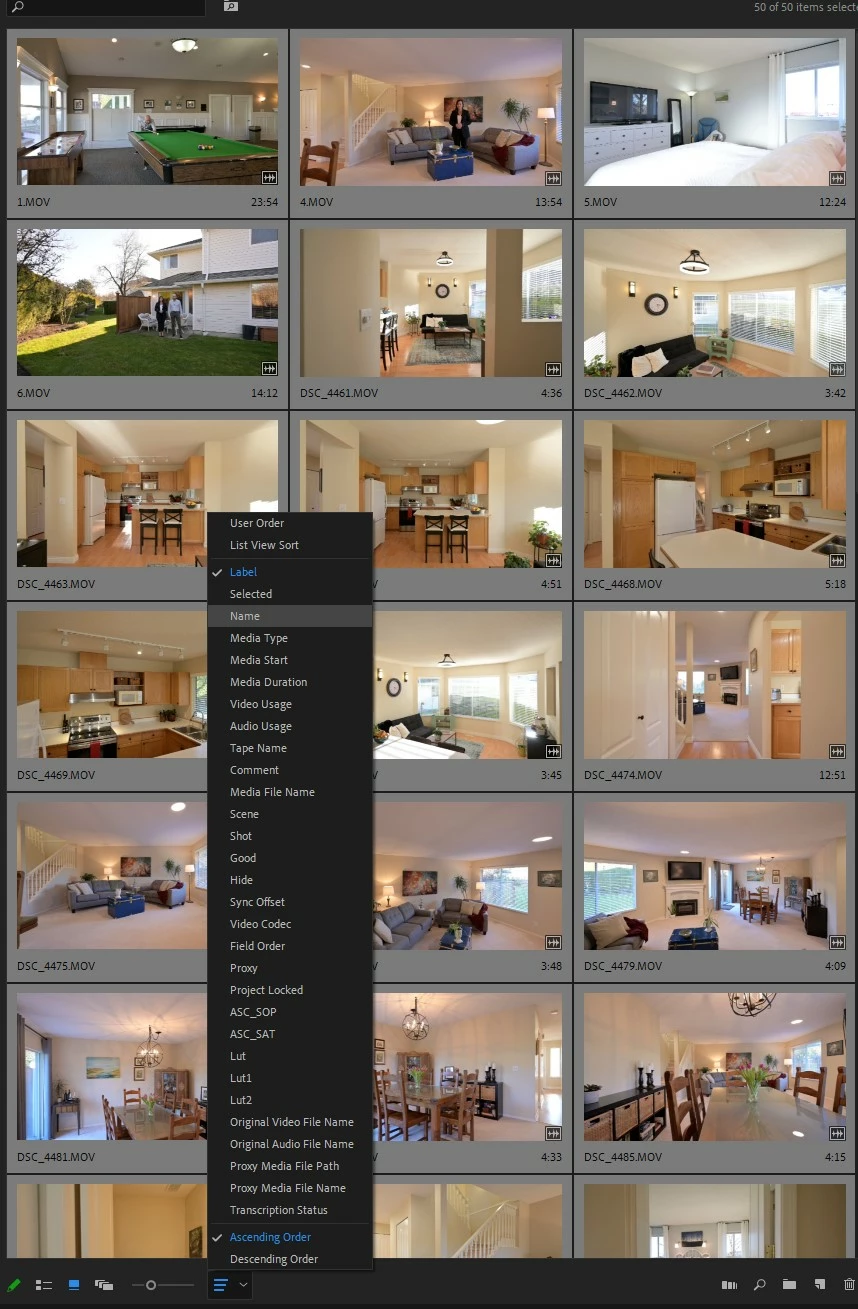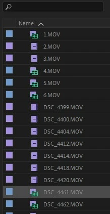 In my example below, the shooter provided a wide mix of footage from drone and DSLR, mostly as .MOVs, some clips have audio, and some of the DSLR clips have also been converted to MP4s (not pictured). I usually organize by lable type but with this shooter's weird mix of files I have to sort by file name:
