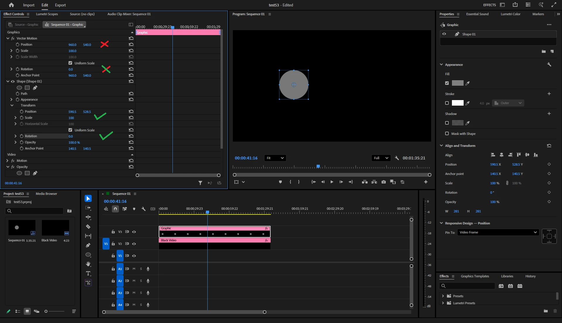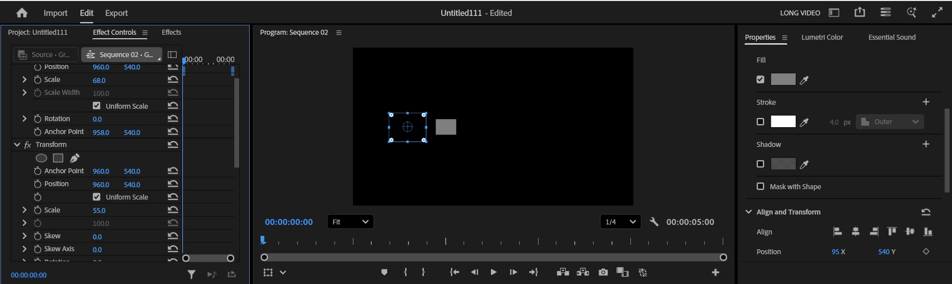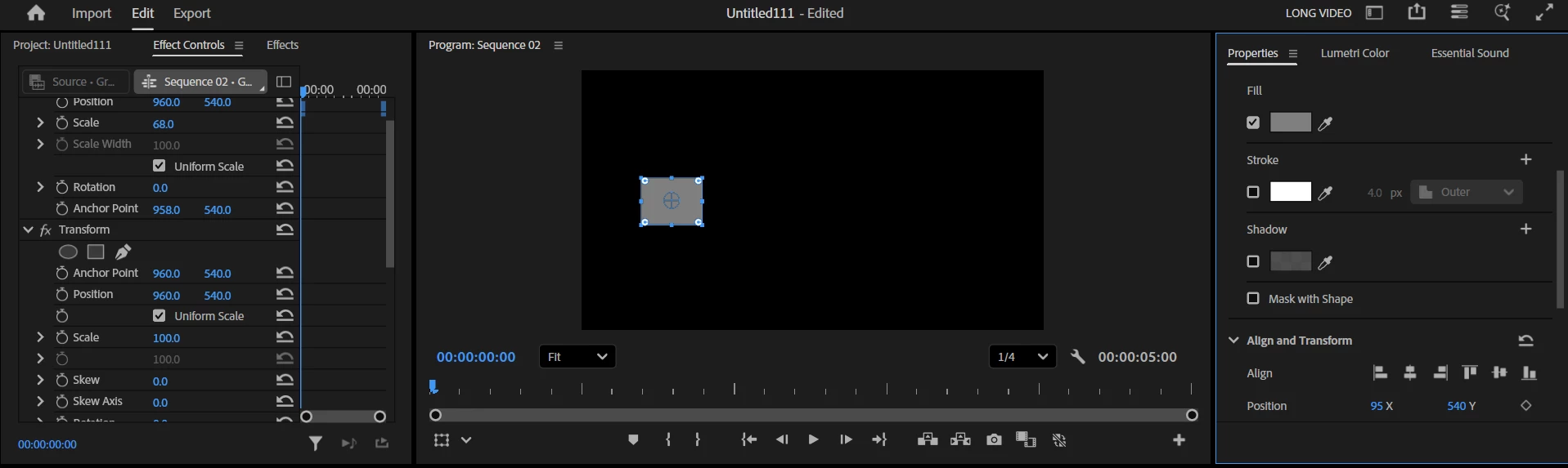 Hello Guys, When I am drawing a shape , a anchor point shoing in its center,but when I am clicking outside the shape another anchor point is showing in the center of the Sequence, Now the problem is when I am rotating or scaling , the rotation is happening accourding to the sequence centered anchor point. Same problem with text also. Kindly help me how to fix this.
