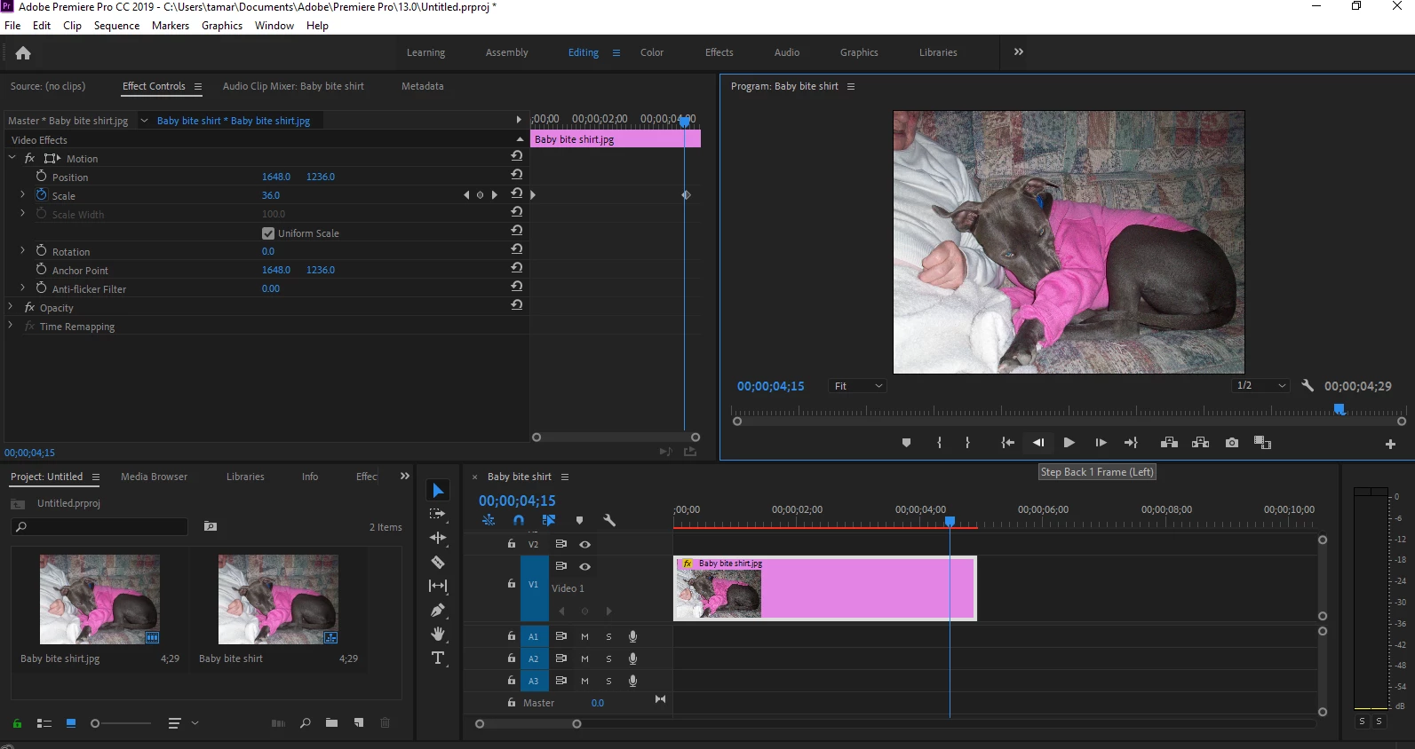 I am trying to create a slow zoom in for a pic.  I add the pic to the timeline, then select the effects control.  Then I press the button next to scale to toggle animation at the beginning of my clip, then I go all the way to the end of my clip and select a keyframe and change the scale size up or down.  When I play the clip back the scale is moving, but the clip just stays the same, never zooms in or out.  What am I doing wrong? Is it something to do with the size of pics I am using, JPG maybe?