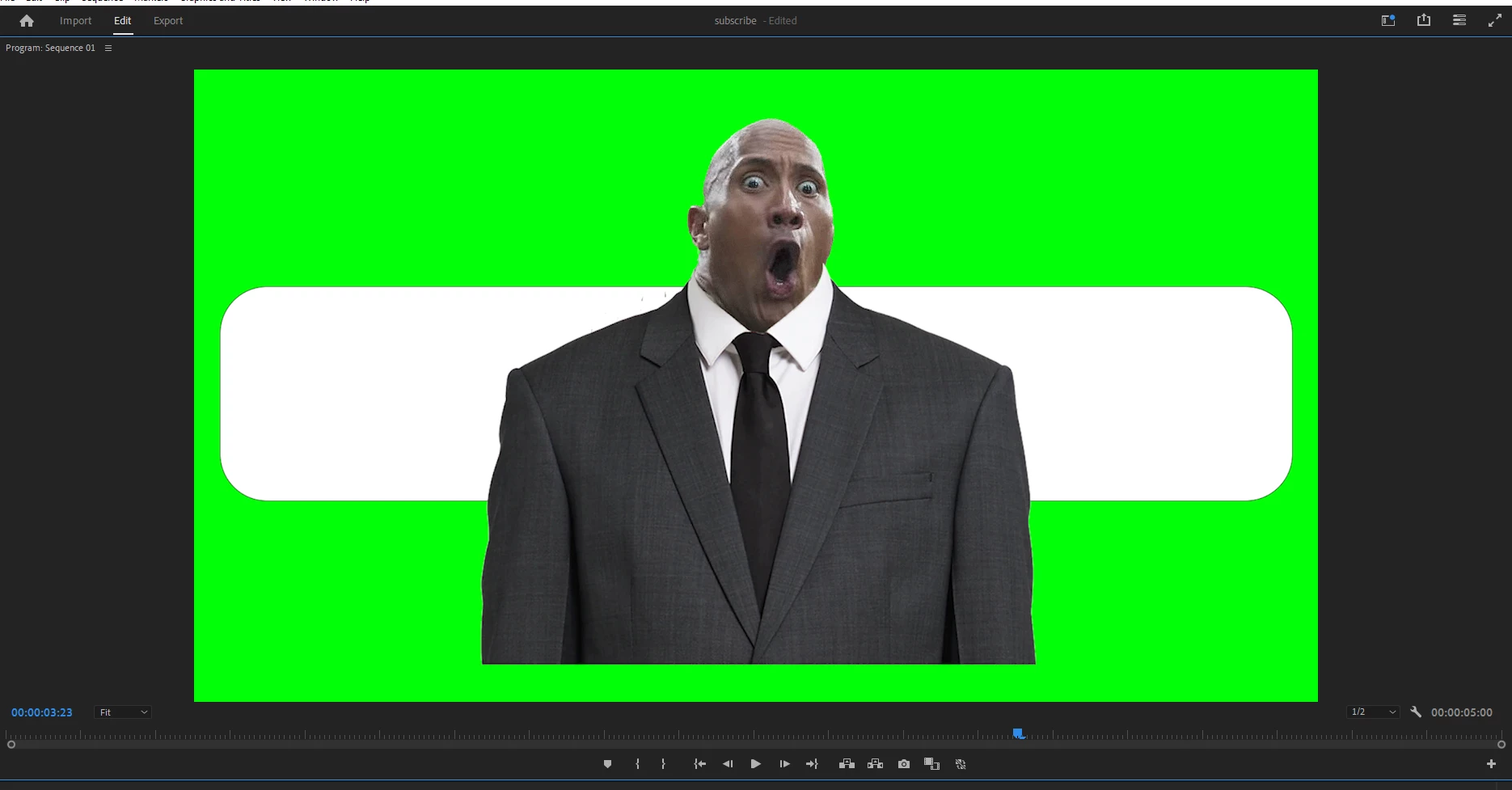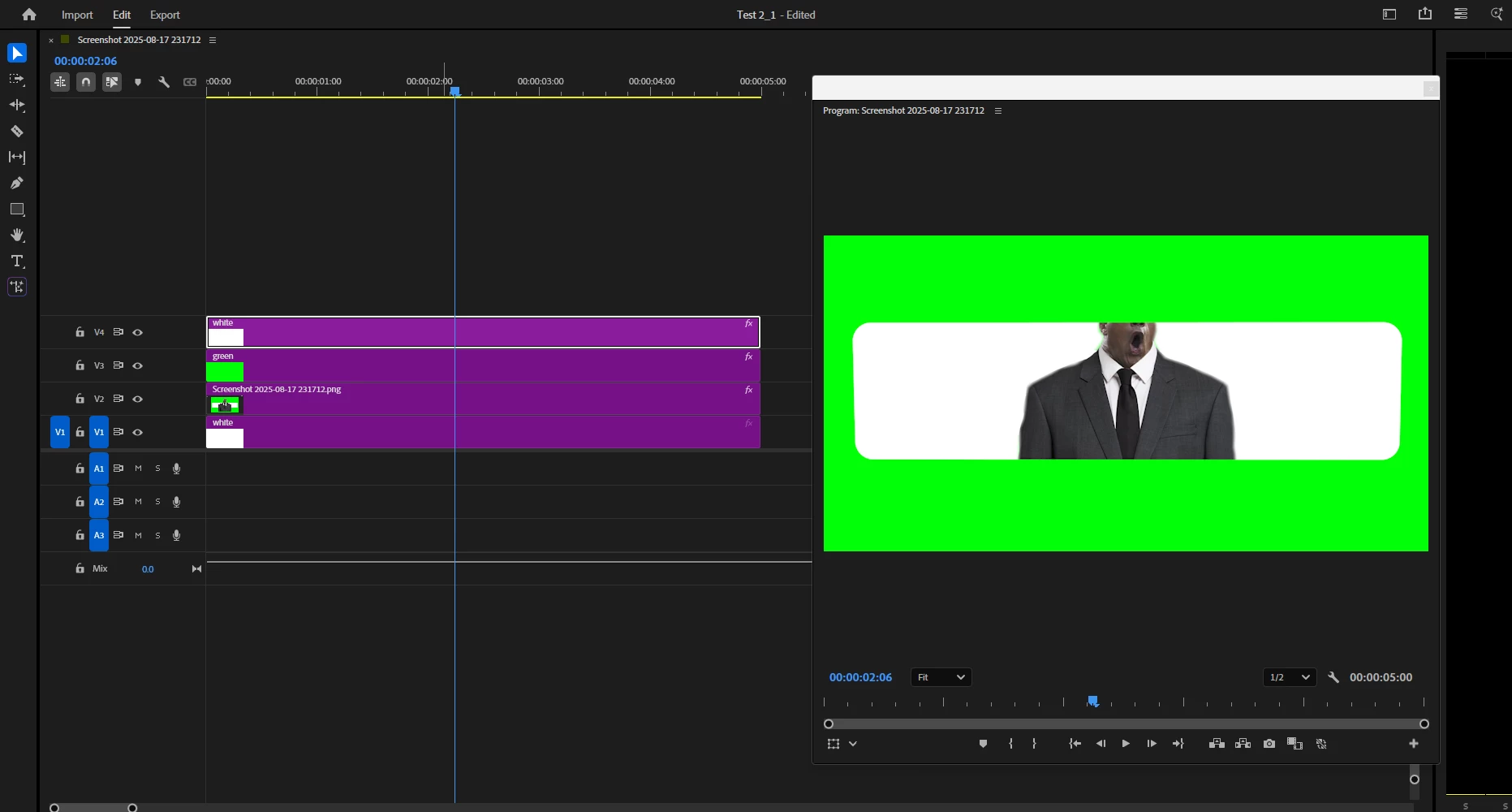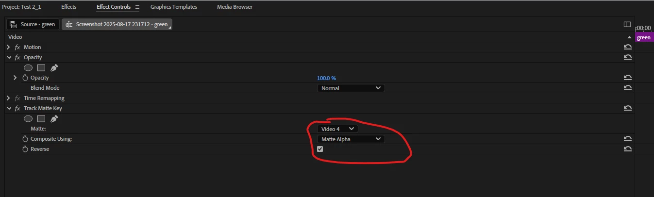 I put a solid white colour on Video track 1, the man on Tr2, the green solid colour on Tr3 and the white shape on Tr4. Then add the track matt key on Tr 3 with the keys selected to Tr 4.