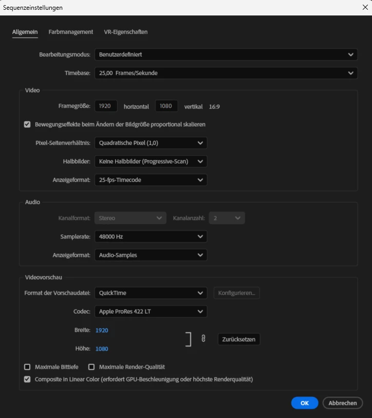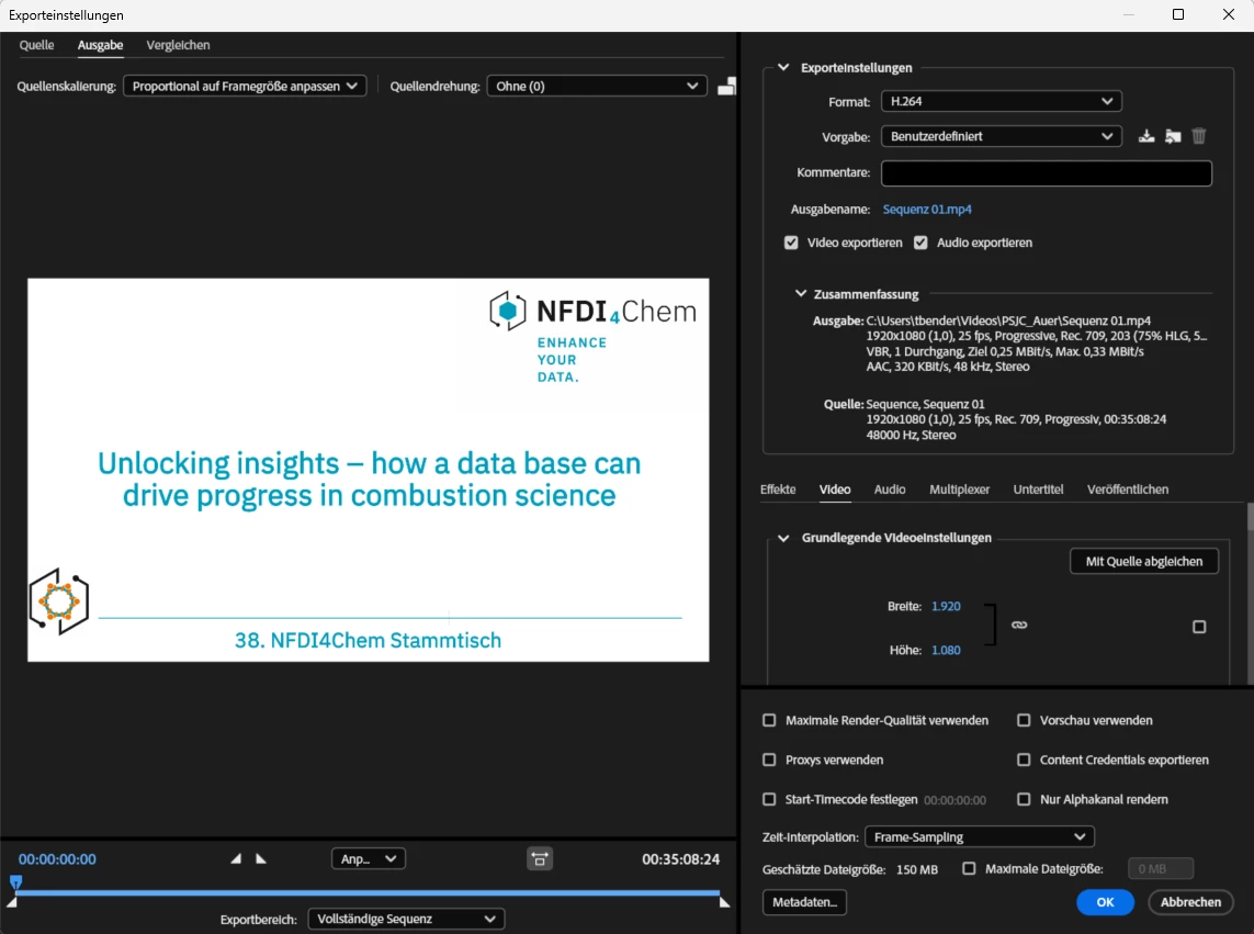 Ich exportiere mit 1920*1080, 25fps, Rate 249kBit/s, Gesamtrate 567kbit/s. Größe 143 MB.