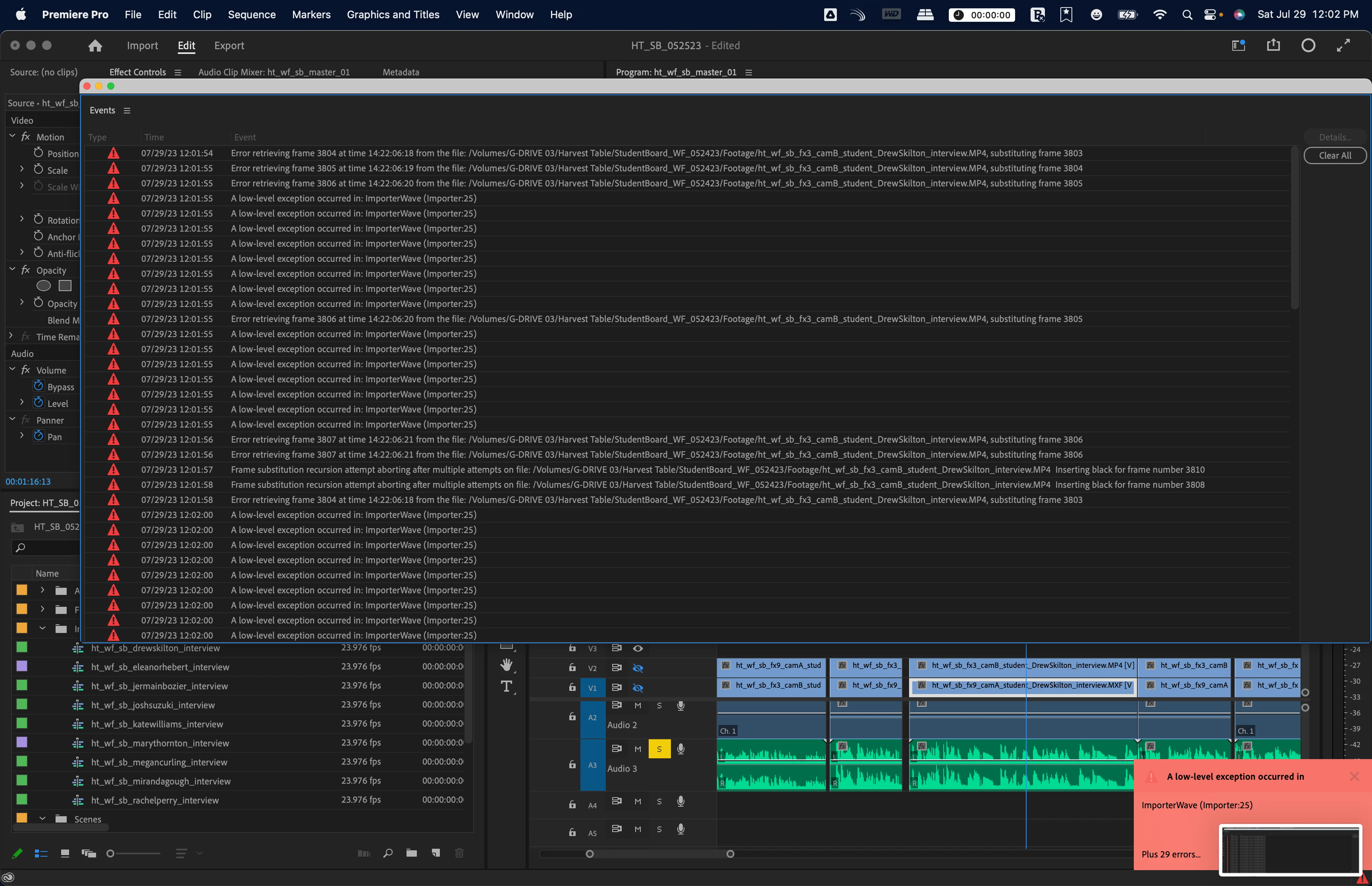 Lagging timeline, material disappears off hard drives, playback stutters, errors with playback