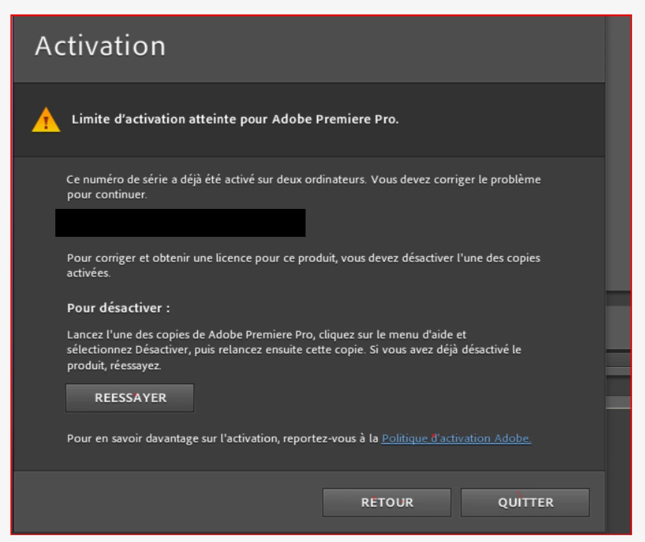 C'est ensuite que je ne peux pas l'activer en raison de la limite d'activations.