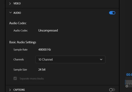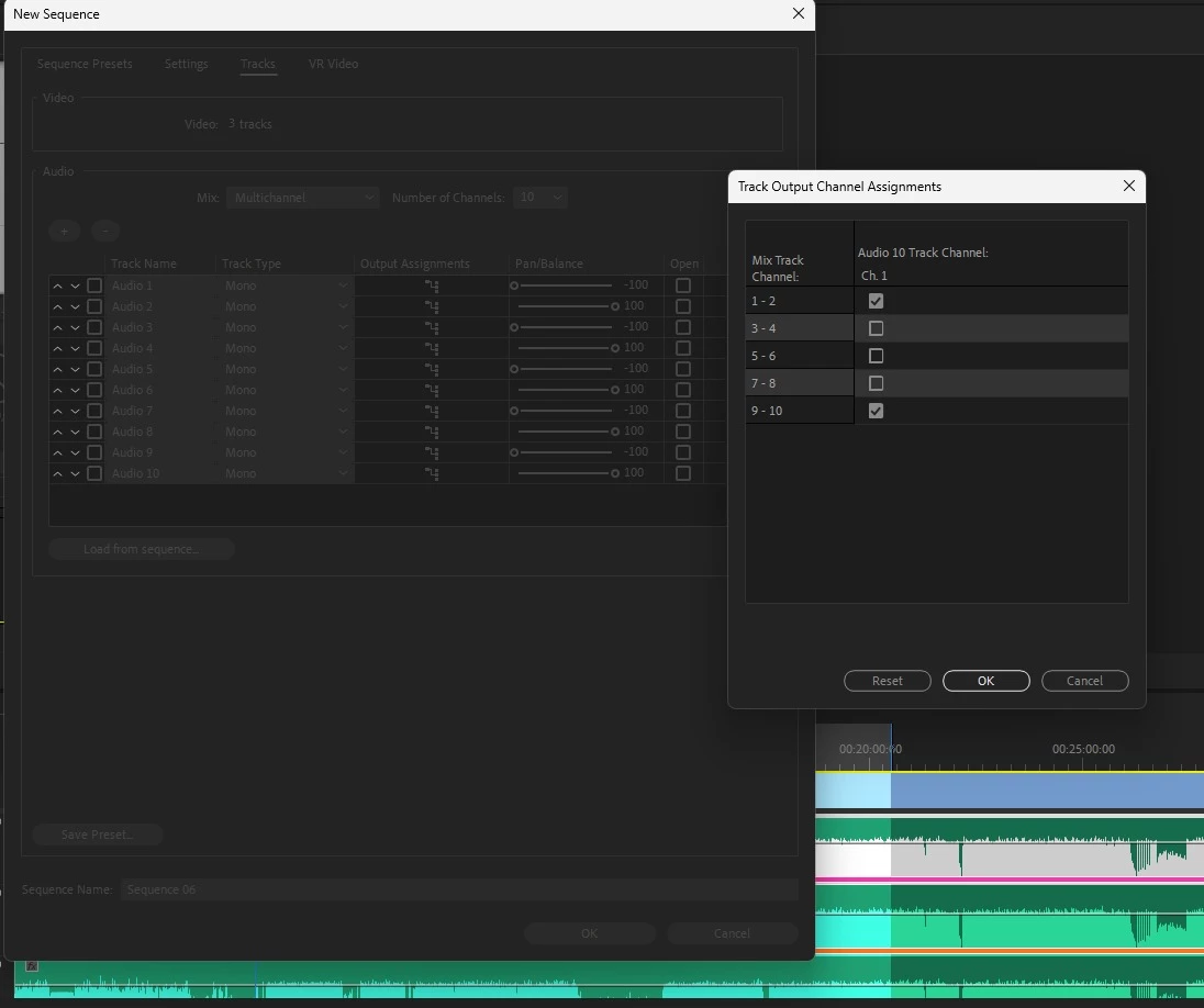 When creating multichannel sequences, I select 10 channels and 10 mono tracks, pan them, and assign a channel for each track. I modify stereo audio to be mono and export MXF indicating those 10 channels.