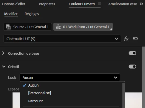 In Lumetri creative Tab I cannot import a LUT via look / parcourir. I get one LUT from the list and cannot access a folder in my computer. See below a screenshot to show where "Parcourir" is