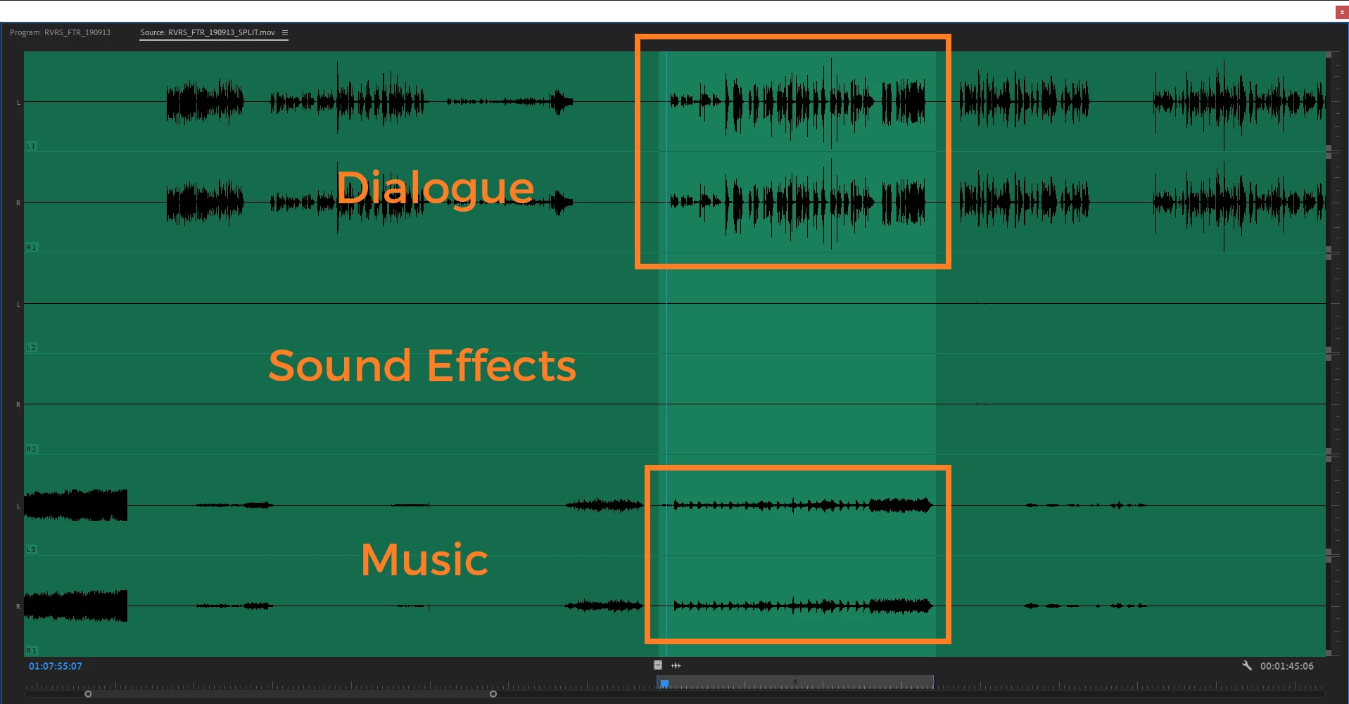 Screenshot supplied with the different tracks tied to the clip and an example of that I would just want a subclip containing only the dialogue and a subclip containing only the music.