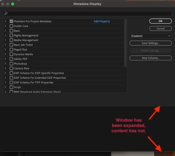 Metadata Display dialog panel - does not respond to window expansion