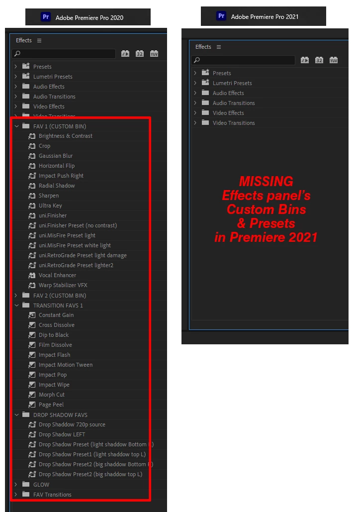 Missing in Premiere 2021 - Effects Panel's CUSTOM BINS and PRESETS folders.