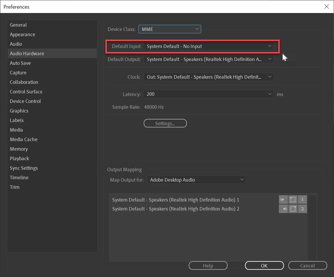 I was going about my own business and editing a video when a dialog box saying "MME device internal error" popped up. My audio was no longer playing during video previews, and when I went to the Audio Devices tab in Preferences to try to change the output device, I received the same error message.