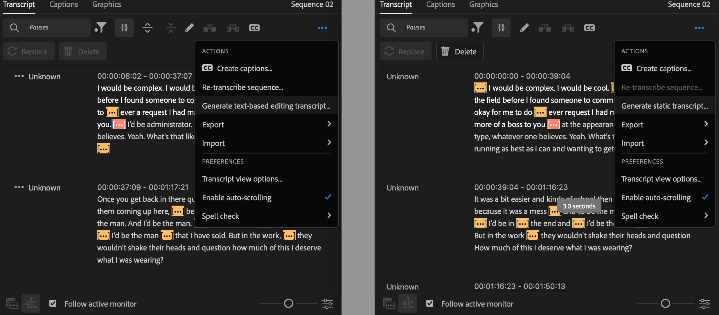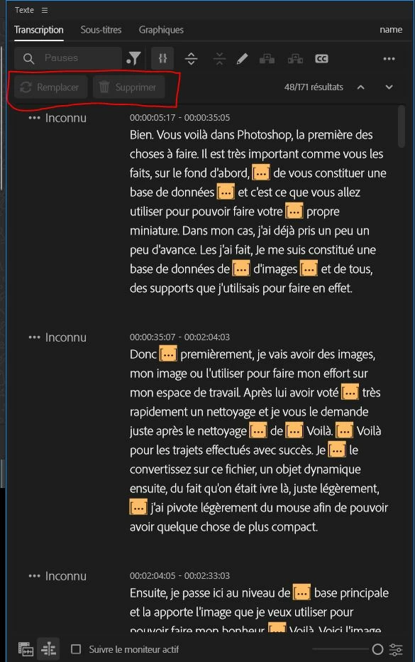 J'ai une inquiétude concernant le bouton de suppression des pauses après avoir effectué une transcription sur Première PRO. Le bouton "supprimer" est Grisé… Si quelqu'un connait la raison et comme je pourrai là réactiver, je lui serai très reconnaissant de l'astuce. Je joins à ma note une capture de mon problème.