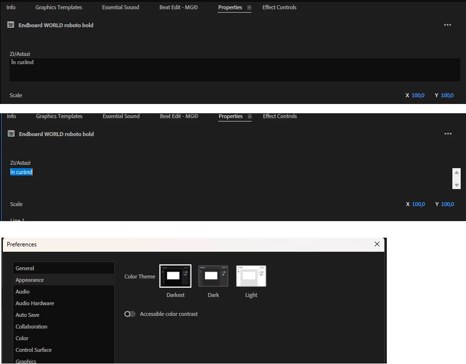 Text box dissapears when editing text for mogrt in properties tab after the 2025 update. Premiere Pro v25.0.0 build 61. Same happens on all color themes, with or without acessible color contrast activated.