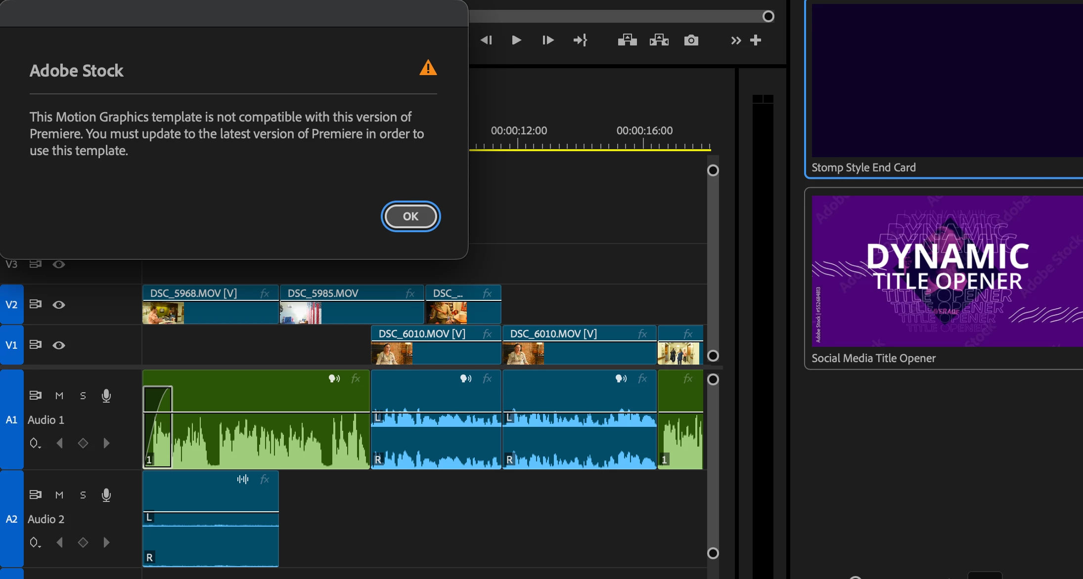 I am trying to drag and drop a motion graphic into my timeline, but every time I try it says that it is not compatible with my version of premiere and to update to the latest version.