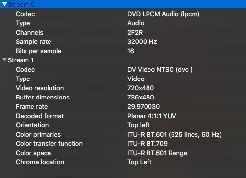Looking at the information the video clips the codec says: Linear PCM, DV/DVCPRO - NTSC, Timecode