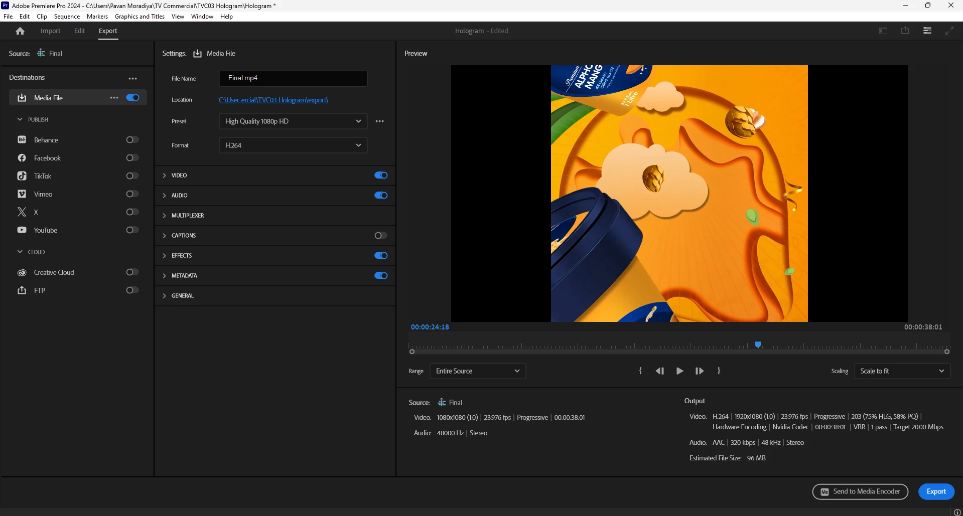 Video: 2840X2160 (1.) | 29.97 fps | Progressive | 203 (75% HLG, 58% PQ) | Hardware Encoding | NVIDIA Codec | 00:01:01:27 | VBR | 1 Pass | Target 75.90 Mbps