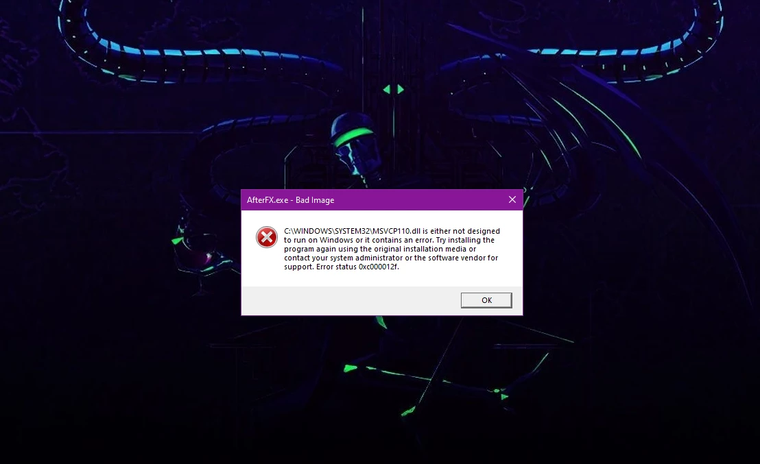"msvcr110.dll" and "msvcp110.dll is either not designed to run on windows or it contains an error."