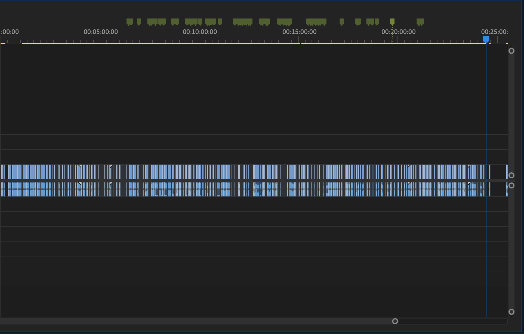 this is a screenshot of one of the sequences after the problem started, all the green markers show wrong audio, the amount was steadily growing